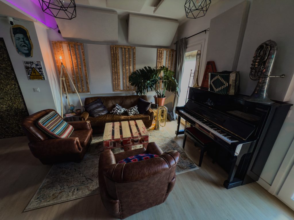 Con una sala diáfana de 35 metros cuadrados, insonorizada y tratada con paneles acústicos, ofrecemos un espacio versátil con una acústica excelente, que incluye áreas tanto para producción y grabación de instrumentos como una zona chill para descansar o escribir y componer.